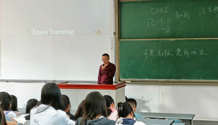 谈及“英语学习”,陈副教授则从“听、说、读、写”以及翻译五大方面分别向同学们推荐了英语学习资源和参考用书,同时以通过专业四级、八级考试为目标,提醒同学们应提前做好准备,制定计划,不要荒废宝贵时间。正所谓“不患无位,患所以立”,陈副教授强调,“只有充分利用时间不断完善自己的人,才能出彩!”
