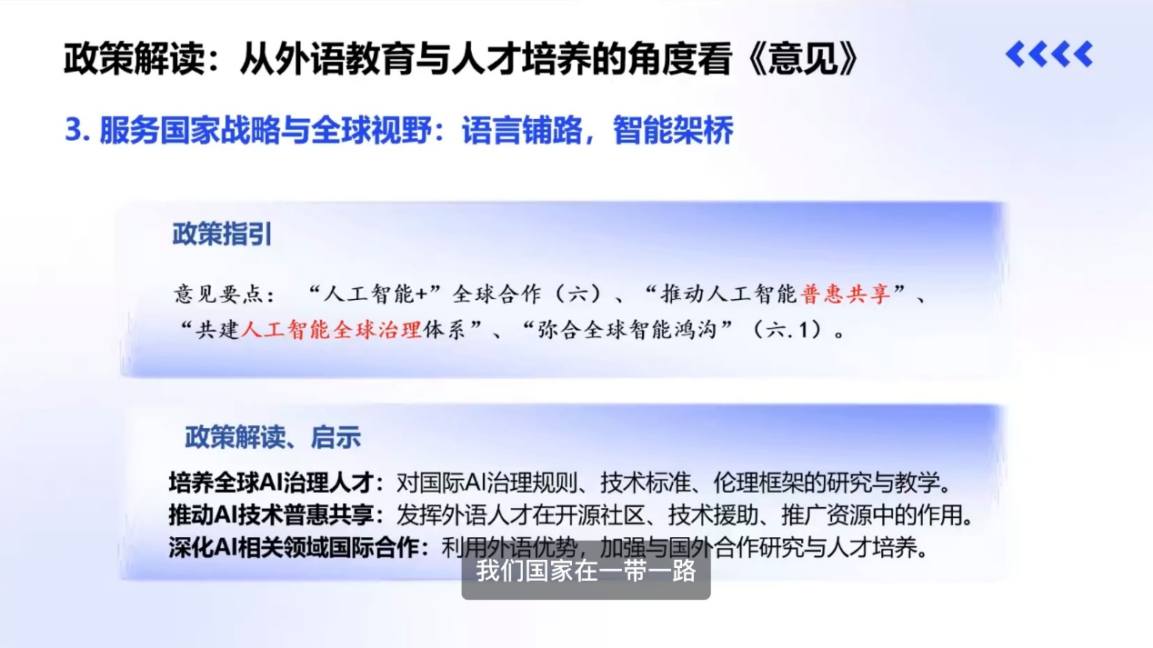 外语教育教学要立足“人工智能+全球合作”要求,加强国际AI治理规则、技术标准的教学研究,发挥外语优势推动AI技术普惠共享,深化相关领域国际合作与人才联合培养。